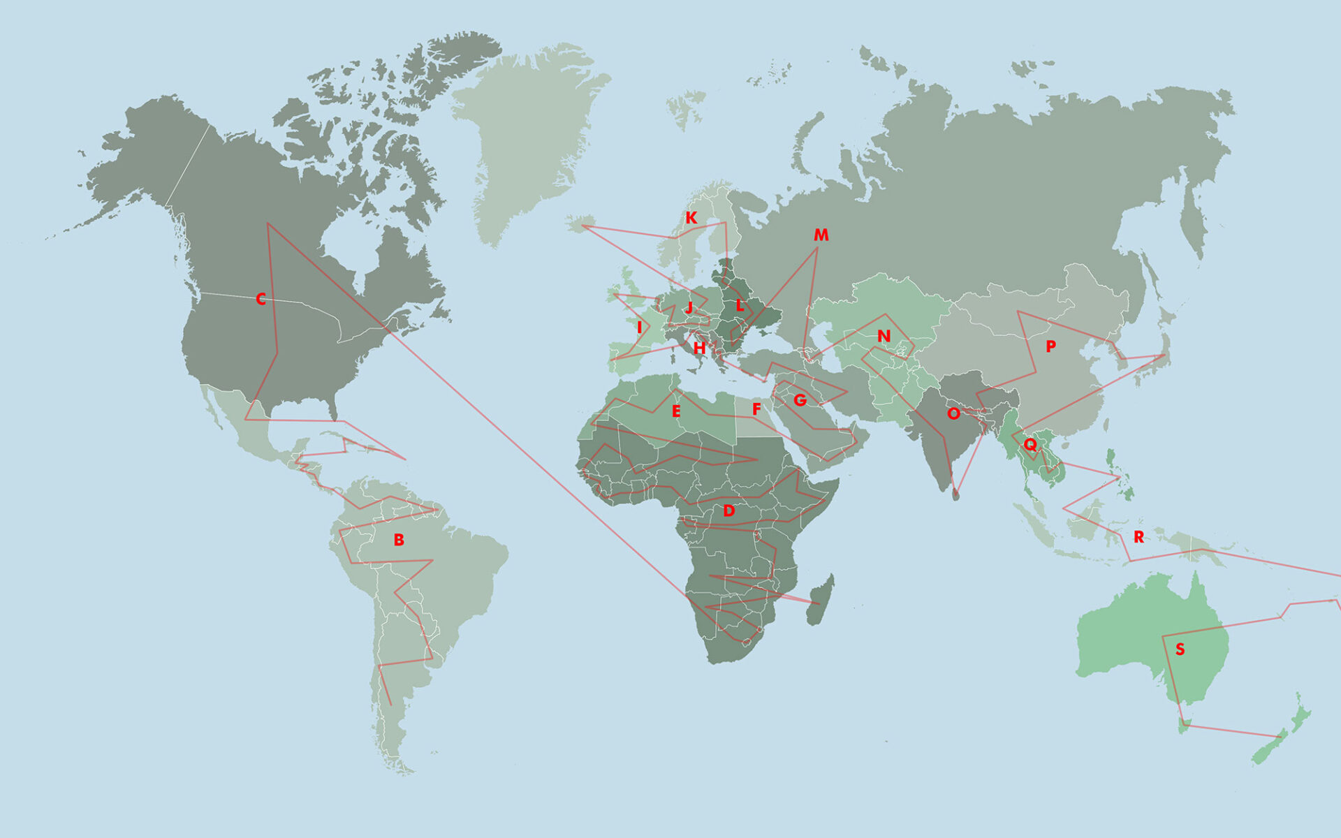 Dann folgen 18 geografisch abgezirkelte Regionen (B) bis (S): Süd- und Mittelamerika, Nordamerika, südliches Afrika, nördliches Afrika, Naher und Mittlerer Osten, Europa, Russland, Zentralasien, Südasien, Ostasien, Südostasien, Ozeanien, Australien und Neuseeland.